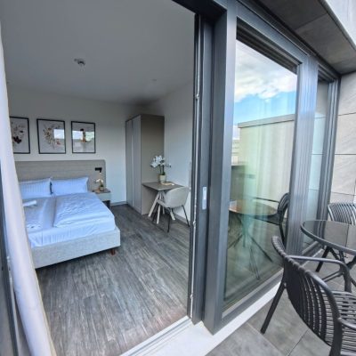 Unser Deluxe Doppelzimmer in Hamburg bietet modernes Design, ein komfortables Doppelbett, Panoramafenster sowie eine Küchenzeile und ein privates Bad. Dank Schallisolierung, Klimaanlage und Fußbodenheizung genießen Sie höchsten Komfort. Ein besonderes Highlight ist der großzügige Balkon mit spektakulärem Ausblick –