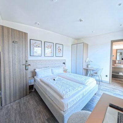 Unser Deluxe Doppelzimmer in Hamburg verbindet modernes Design mit höchstem Komfort. Es verfügt über ein gemütliches Doppelbett, Panoramafenster, Schreibtisch, Flachbild-TV und kostenloses WLAN. Eine Küchenzeile sowie ein privates Bad stehen ebenfalls zur Verfügung. Dank Schallisolierung, Klimaanlage und Fußbodenheizung genießen Sie Ruhe und Wohlbefinden – perfekt für Paare, Geschäftsreisende oder Kurzurlauber im Apartment Hotel Hamburg.